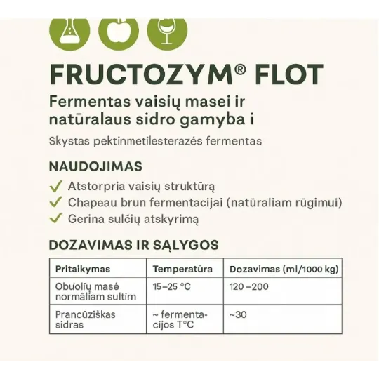 Fermentas Fructozym® Flot specialus fermentas, skirtas fermentiniam vaisių gabaliukų stabilizavimui, ruošiant vaisius. Fermentas idealiai tinka gaminant sidrą, taikant "Keeving" metodą.
