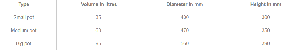 Puodai skirti guliašui ir (arba) sriuboms virti, sultims, uogienėms, vaisiams smulkinti ir spausti ir pan. Dugno storis - 1,5 mm.