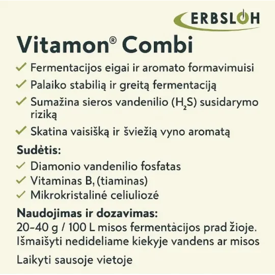 Maistinė medžiaga Vitamon®Combi Erbslöh – tai patikimas pasirinkimas profesionaliems ir namų vyndariams, siekiantiems išvengti fermentacijos problemų ir sukurti kvapnų, švarų, subalansuotą vyną ar sidrą.